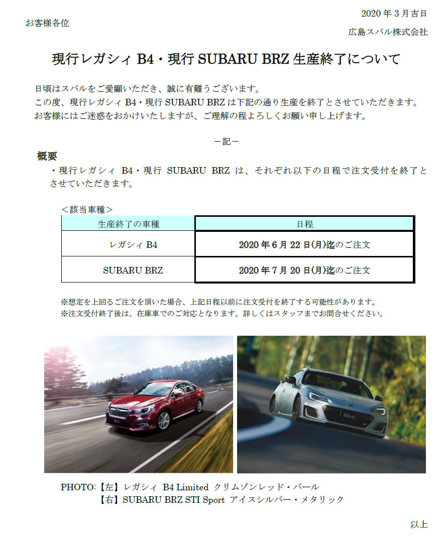 現行レガシィB4・現行SUBARU BRZ生産終了について