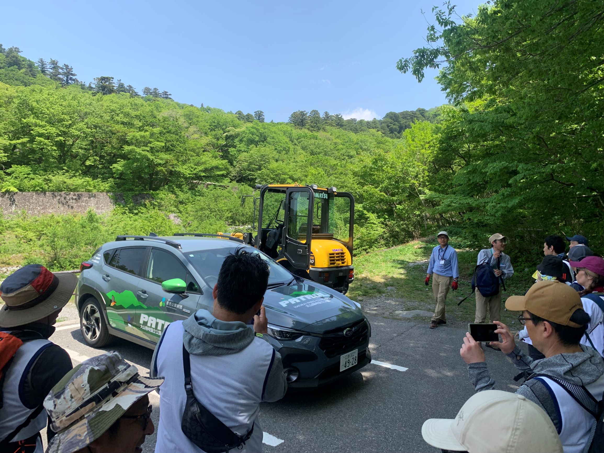 まずは、午前中の座学で学んだ、一木一石運動協力の為に、大山を望む南光河原(なんこうがわら)に向かいます。ここで、パトロールカーとご対面!自然のなかだとデザインが更に映えますね。皆写真をパシャリ!!