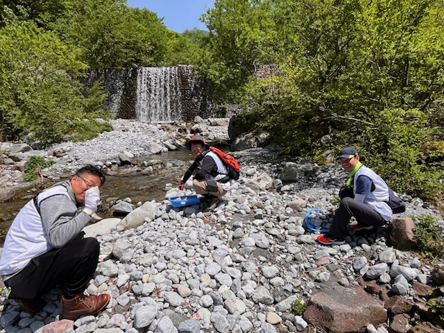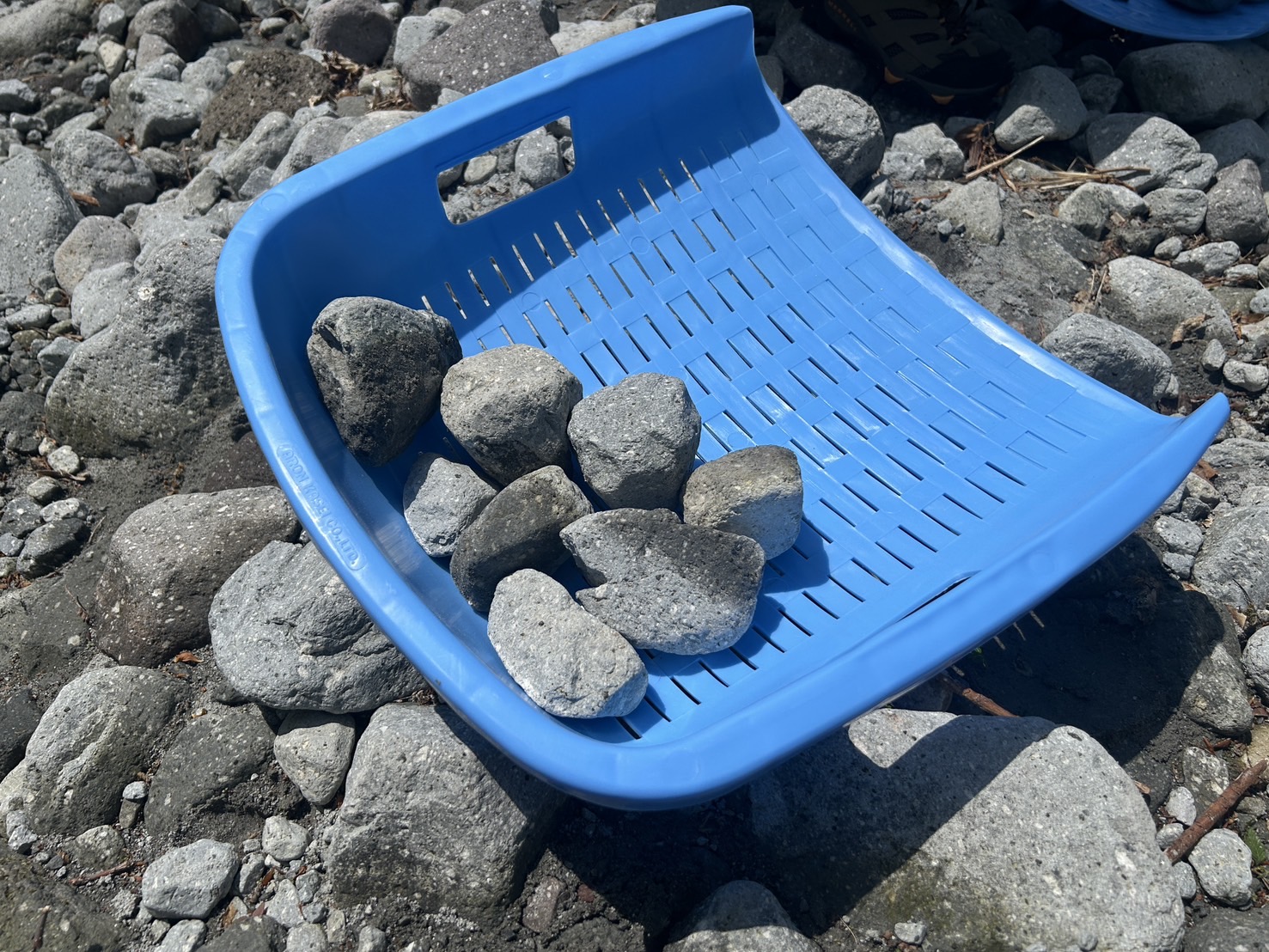 財団スタッフさんの説明を受けながら、河原に降りて握りこぶし大の石を拾っていきます。大山の山頂から転がり、河原に流されてきた石は角が取れてどれも丸みを帯びています。
