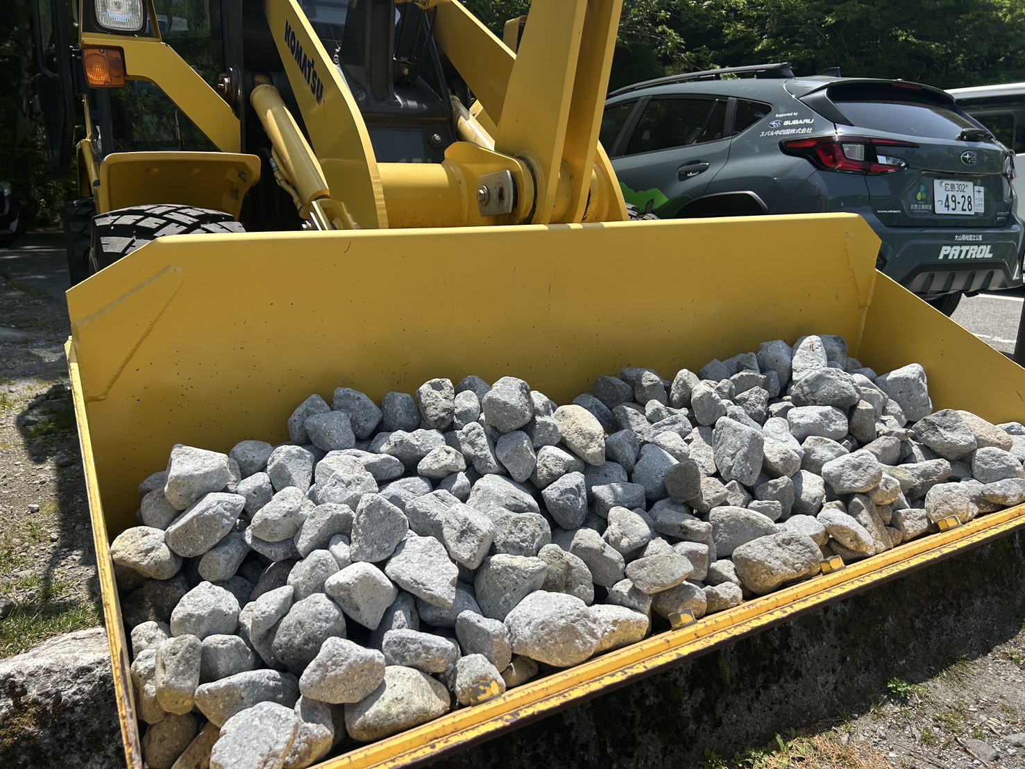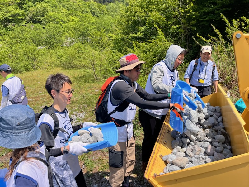 石箕(いしみ)に石を入れ、ホイールローダーのバケットにどんどん運んでいきます。スタッフさんの経験則から15分程度かかるだろうと開始するも、スバルチームの行動力で10分でバケットがいっぱいになりました。