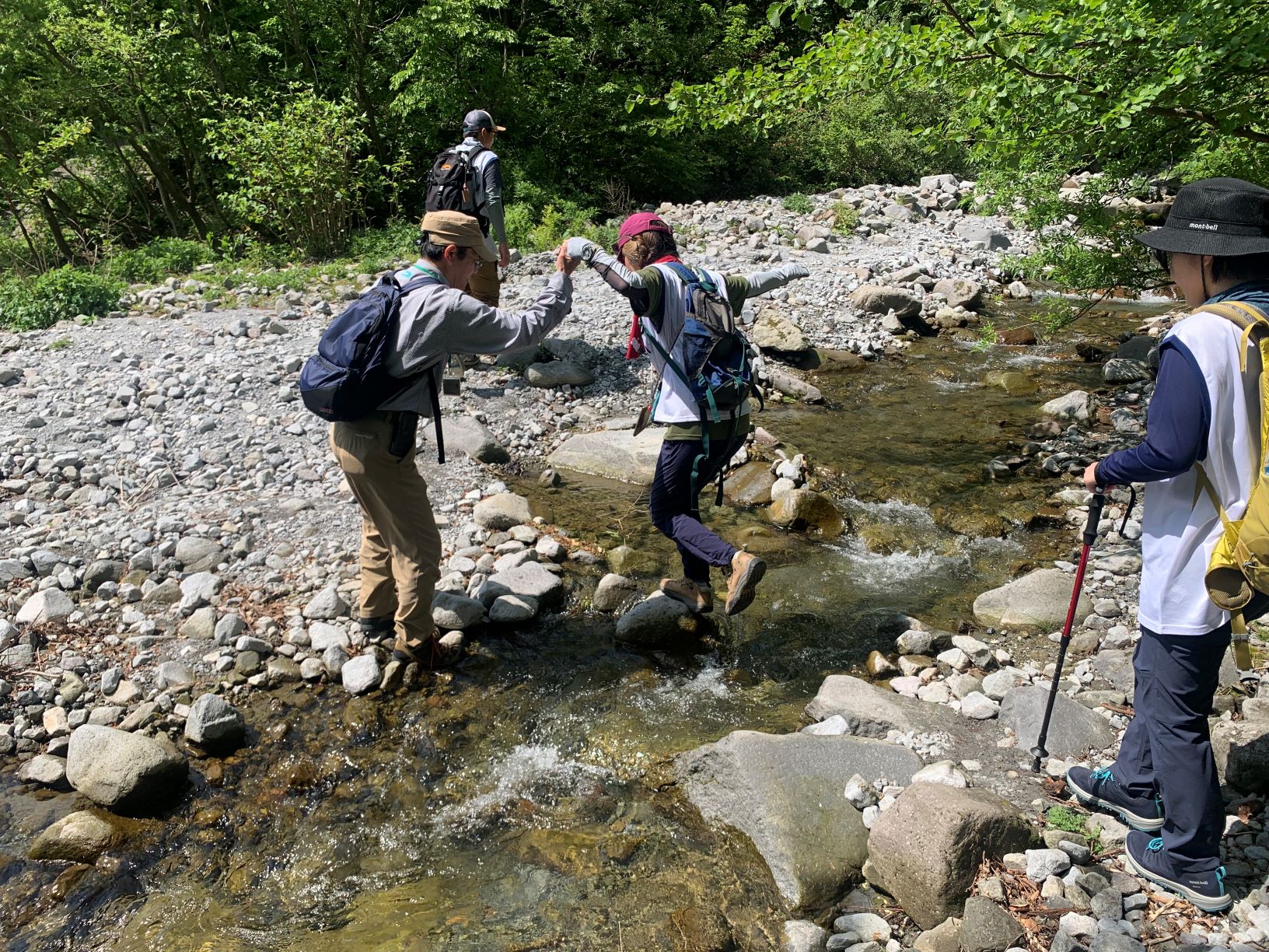 森を抜けたら川渡りが待っています。スタッフさんに手を支えられて渡る人、岩の上を軽快に超えていく人、皆自然を楽しんでいます!この河原が先ほど石拾いをした河原につながります。大山の雪解け水が爽やかな音を立てて流れる河原。水は透明で冷たいです。森を抜けてほっと一息の時間。