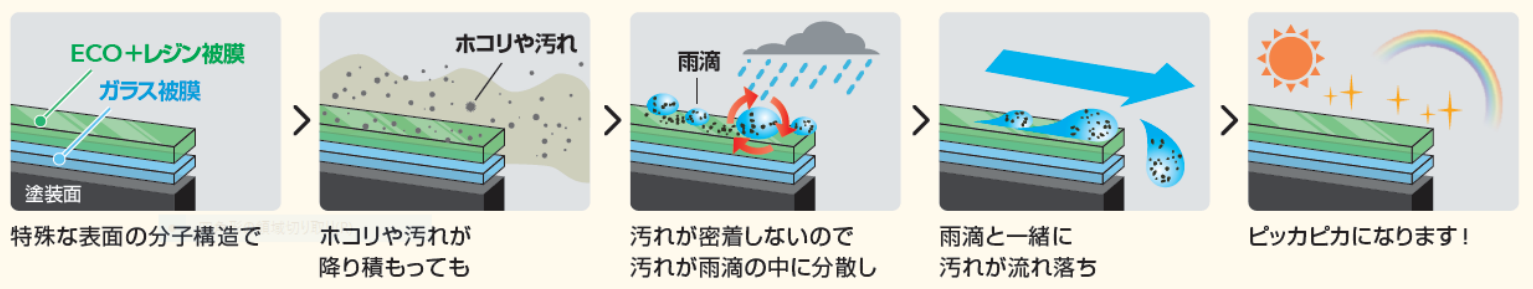 水だけではなくホコリなどの汚れの原因も水もろとも弾くので雨が降ると逆に車がキレイになってしまう現象が起こるんだそうです![]()