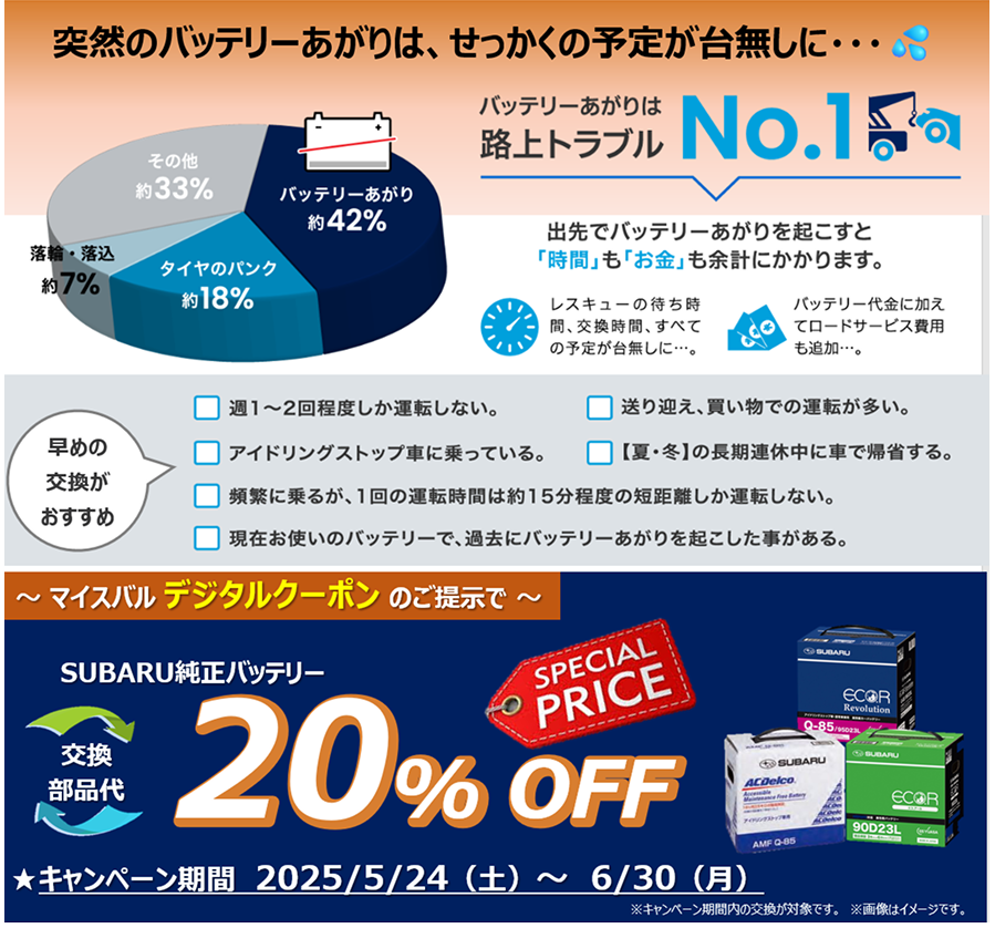 クーポン1 SUBARU純正バッテリーキャンペーン 交換部品代20%OFF