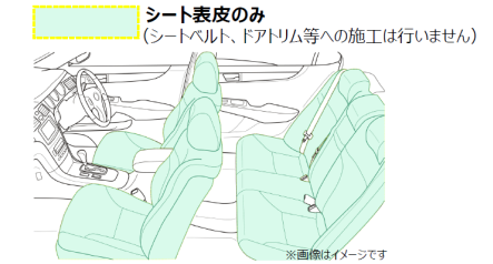 シートコーティングは、シートをコーティングし防汚、耐水、耐摩耗性、抗菌、防カビの効果が得られます。革、合成皮革、ファブリックシート全てに施工可能です。効果の目安は3年です。※お車の使用状況により変わります