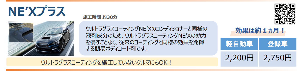 NE’Xプラスは撥水系ボディコート剤です。ボディにコーティングを吹きかけ、マイクロファイバークロスで拭きあげていきます。施工することにより水はじきが良くなりボディに付着している汚れも水と一緒に流れやすくなります。