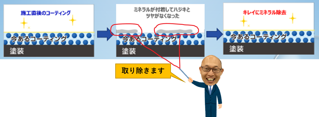 表面に付いたミネラルを取り除く事で施工したコーティング膜が再び