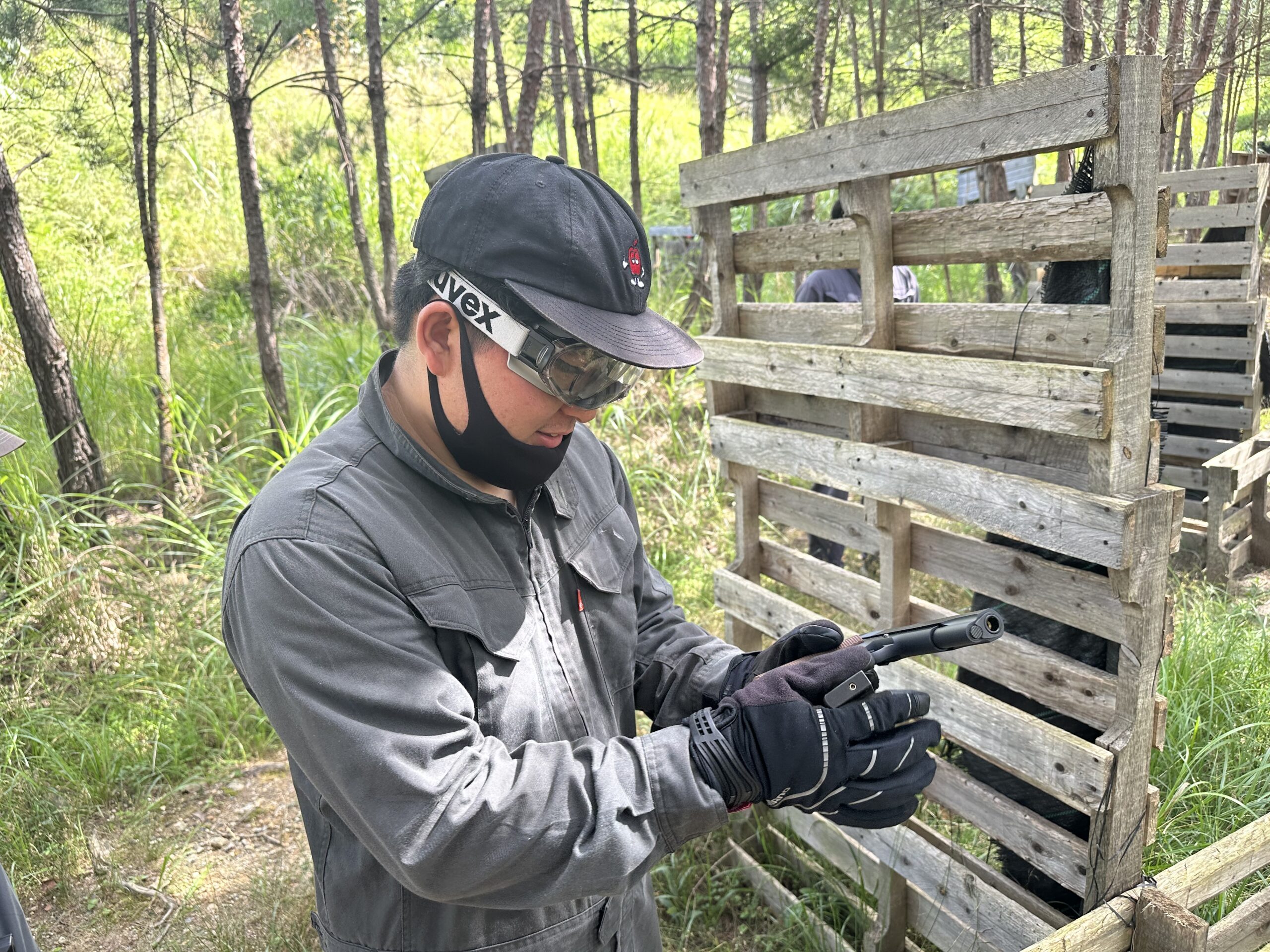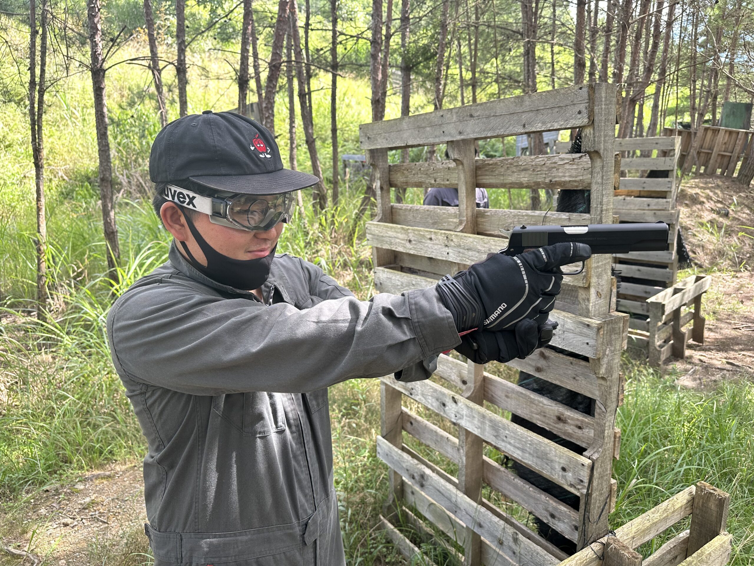 ゲーム前の薄田さんの様子です。ハンドガンを確認しております。