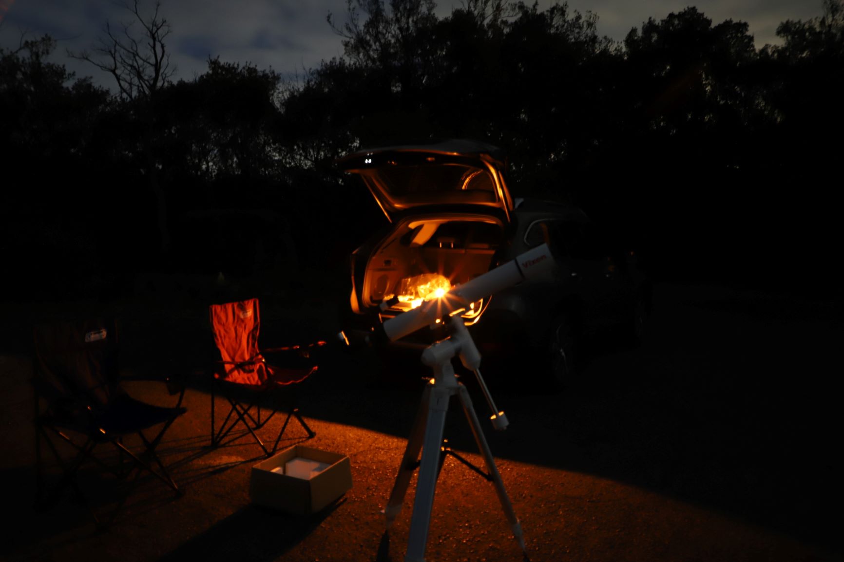 荷物はかなり多くて、天体望遠鏡、一眼レフカメラ、椅子2つにランタン。望遠鏡やカメラのための三脚などもある。今回は薄田助手がいて助かった。