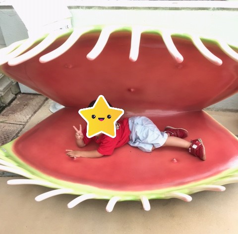 ついでに息子はハエトリグサのオブジェで寝転んでみました。