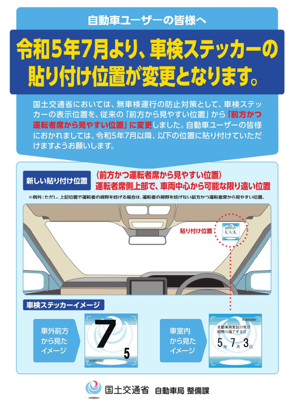 2023年7月3日から車検証ステッカーの貼り付け位置が変更となっております!