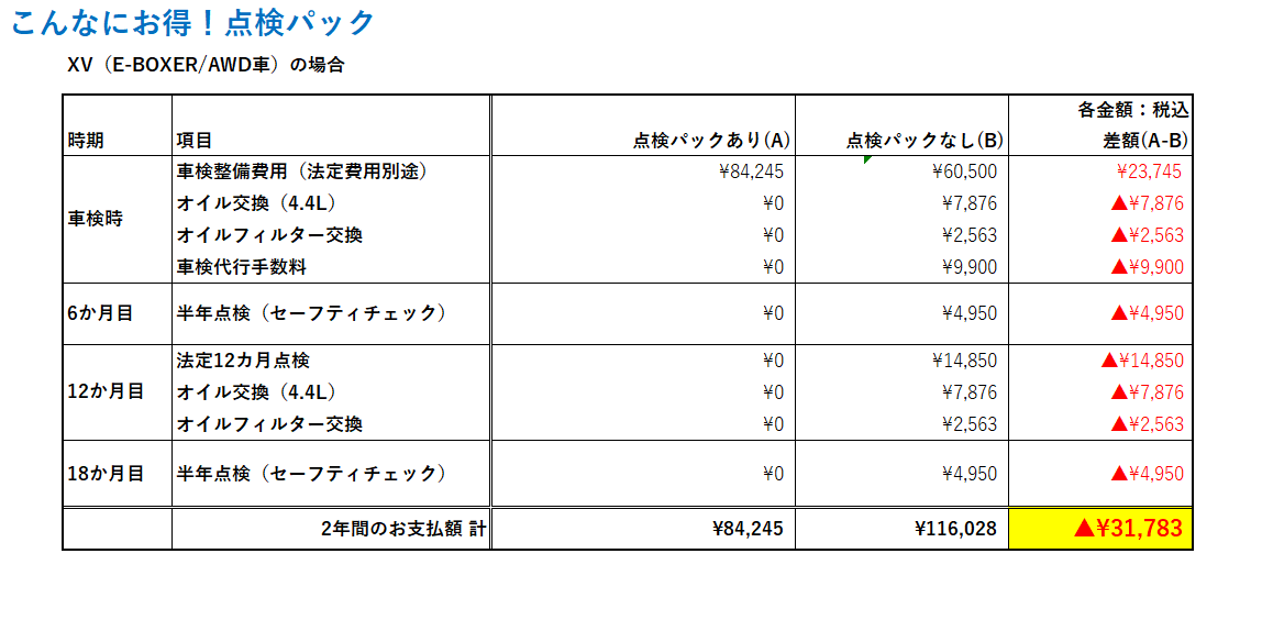 こちらは車検時加入タイプ(オイル交換・車検整備付きタイプ)のもので、SUBARU XVの点検費用をもとに加入あり/なしの金額差を表にしたものです。