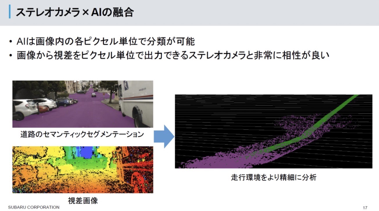 アイサイトの特長であるステレオカメラの認識能力に、AIの判断能力を加えることで、さらなる進化を図りたいとSUBARUは考えています。ステレオカメラは視差を利用して画素(ピクセル)ごとに距離情報を算出でき、AIはカメラ画像から車両や歩行者、道路などを識別し、やはり画素ごとに物体属性を持たせられます。