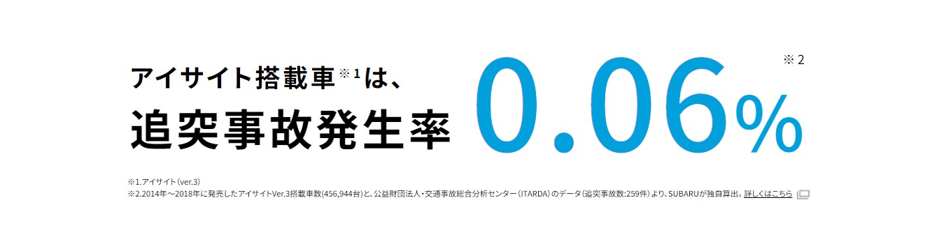 *2:2014~2018年に発売したアイサイトver.3搭載車数(456,944台)と、公益財団法人・交通事故総合分析センター(ITARDA)のデータ(追突事故数:259件)より、SUBARUが独自算出。