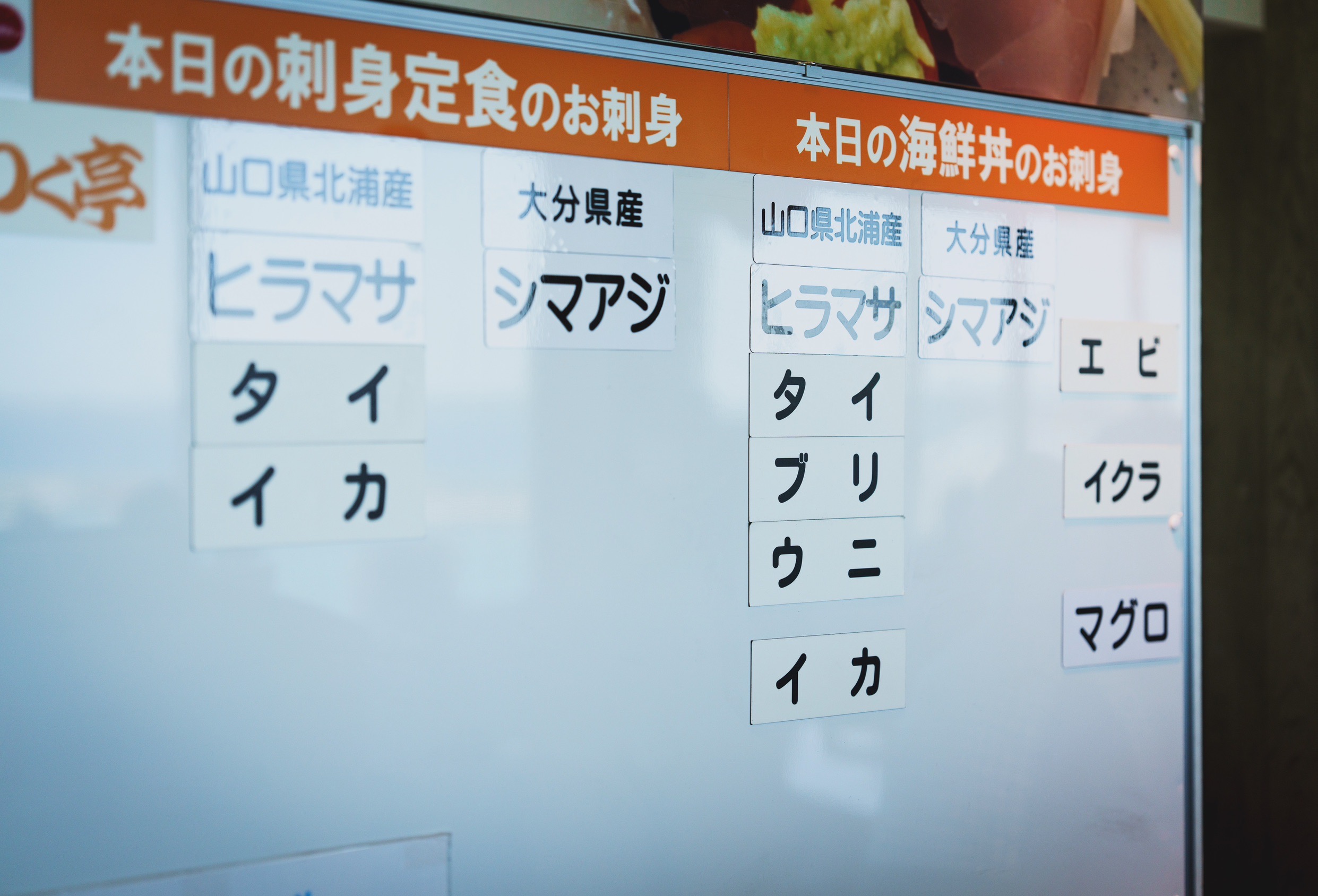 定食や丼には、地元の海の幸が使用されている事が掲示されています。