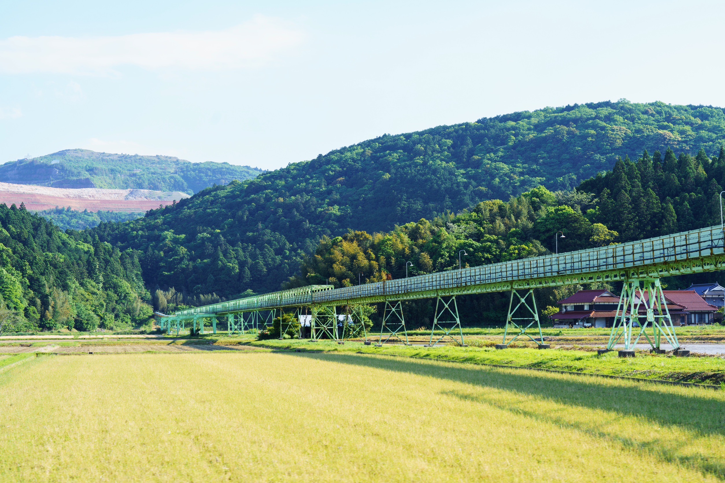 調べてみると、写真後ろに見える秋芳鉱山から、長門市仙崎の港まで石灰石を運ぶベルトコンベア(住友大阪セメント株式会社所有)とのこと。