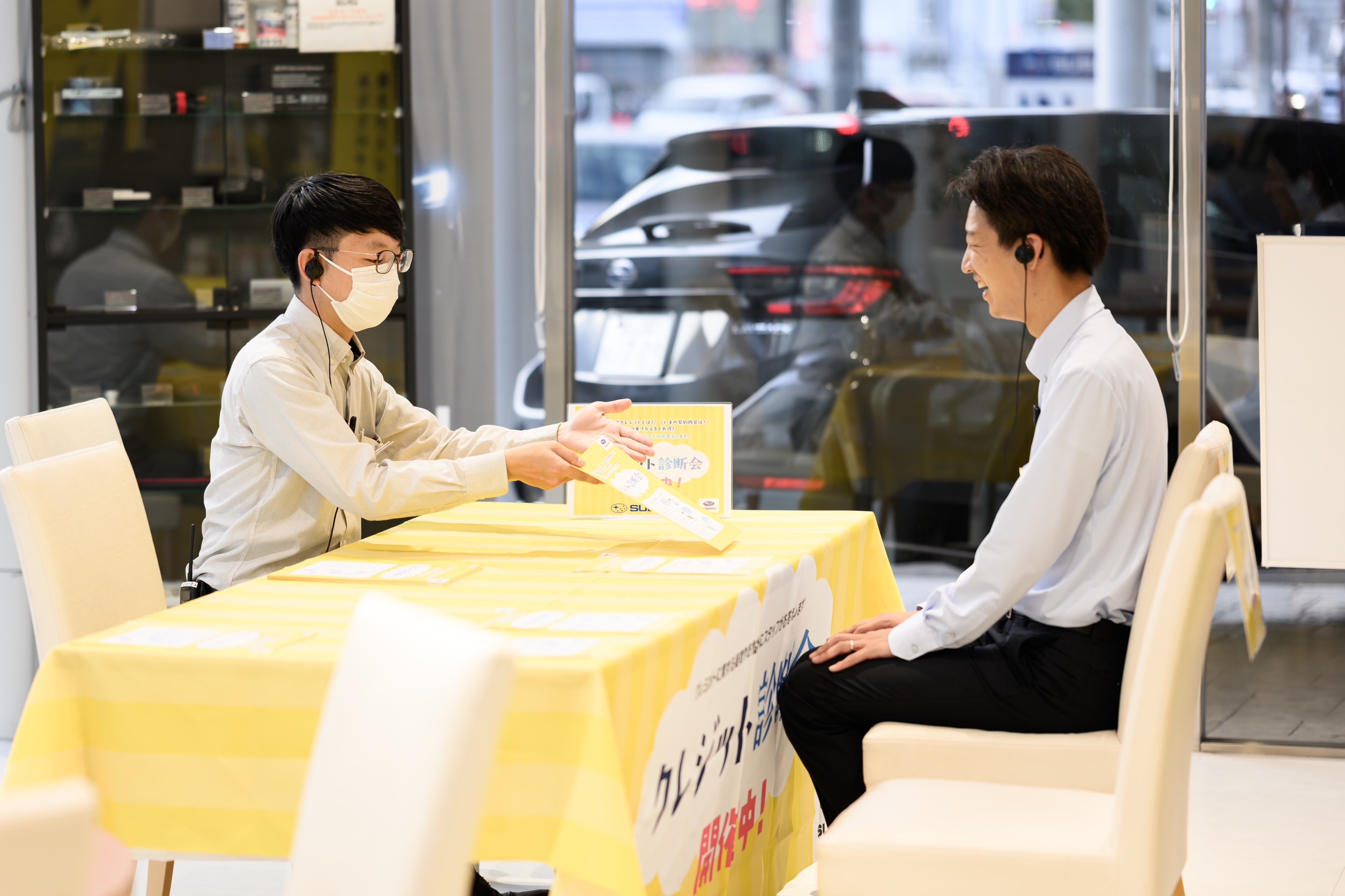 品川カーライフアドバイザーと、お客様役の山﨑カーライフアドバイザー