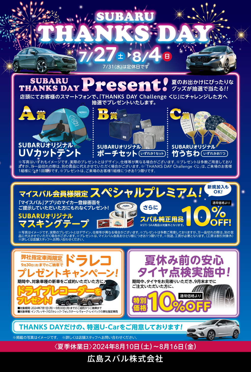 誠に勝手ながら広島スバルは下記の期間、休業とさせていただきます。