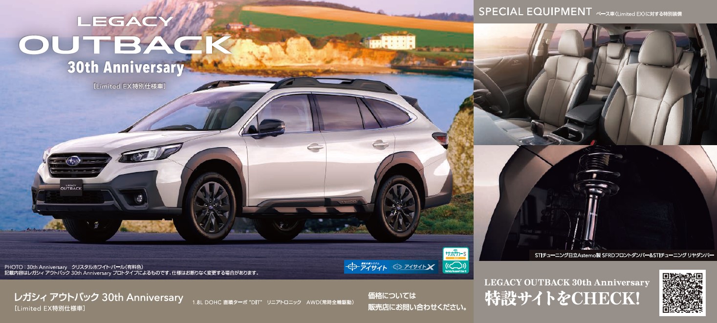 現行LEGACY OUTBACKの上質な乗り心地をベースに、スポーツセダンのような操縦安定性と素早いステアリング応答性を融合させた、500台限定のLimited EX特別仕様車「30th Anniversary」のご案内です。