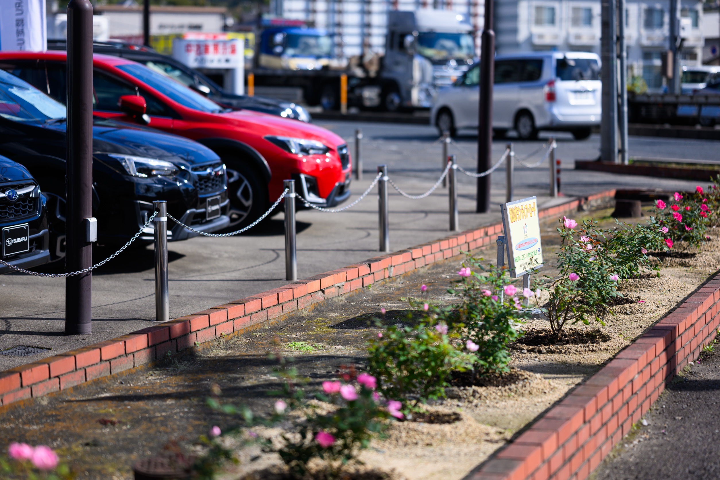 広島スバル株式会社福山店(以下福山店)は、令和6年10月28日に国土交通省中国地方整備局福山河川国道事務所(以下福山河川国道事務所)および、福山市世界バラ会議推進室(以下福山市)とともに、店舗に隣接する国道2号線沿いの植栽に薔薇を植樹しました。
