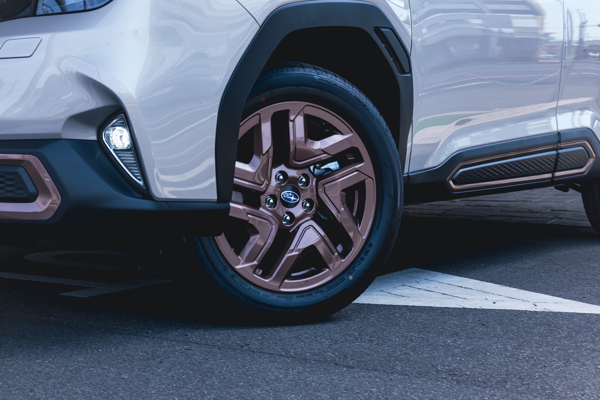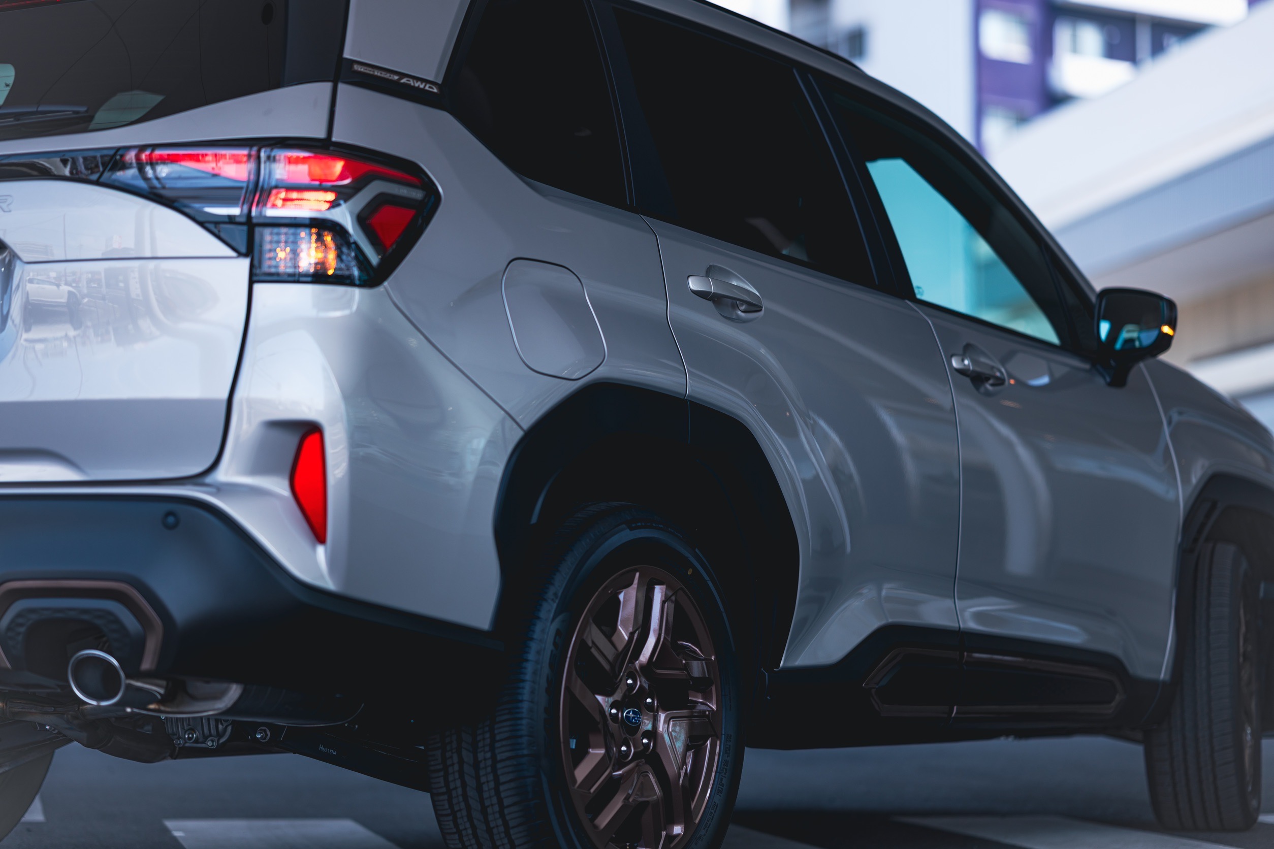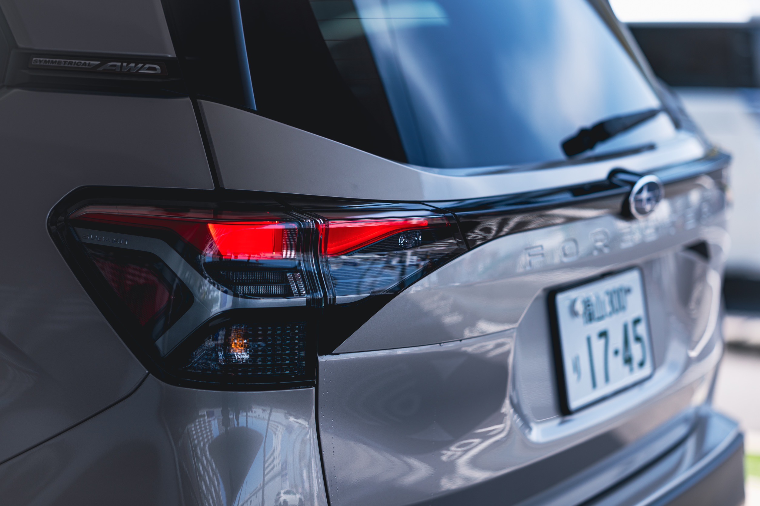 谷)特にフロントまわりのデザインが凝っています。大きなグリルからボディ端まで伸びたヘッドランプにかけてのつながりが塊感を演出し、厚みのあるデザインとなっています。リアまわりは左右テールランプを繋げるガーニッシュが、流行りのデザインを感じさせます。また、バッグドア中央部に位置するフォレスターの車名ロゴが今までのスバル車になかった処理がしてあり、お洒落です。