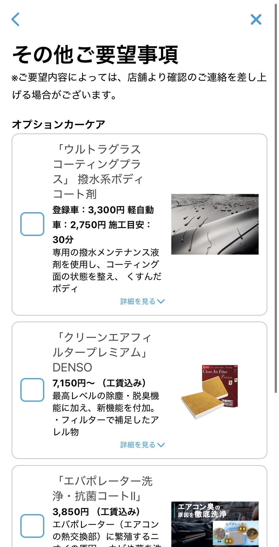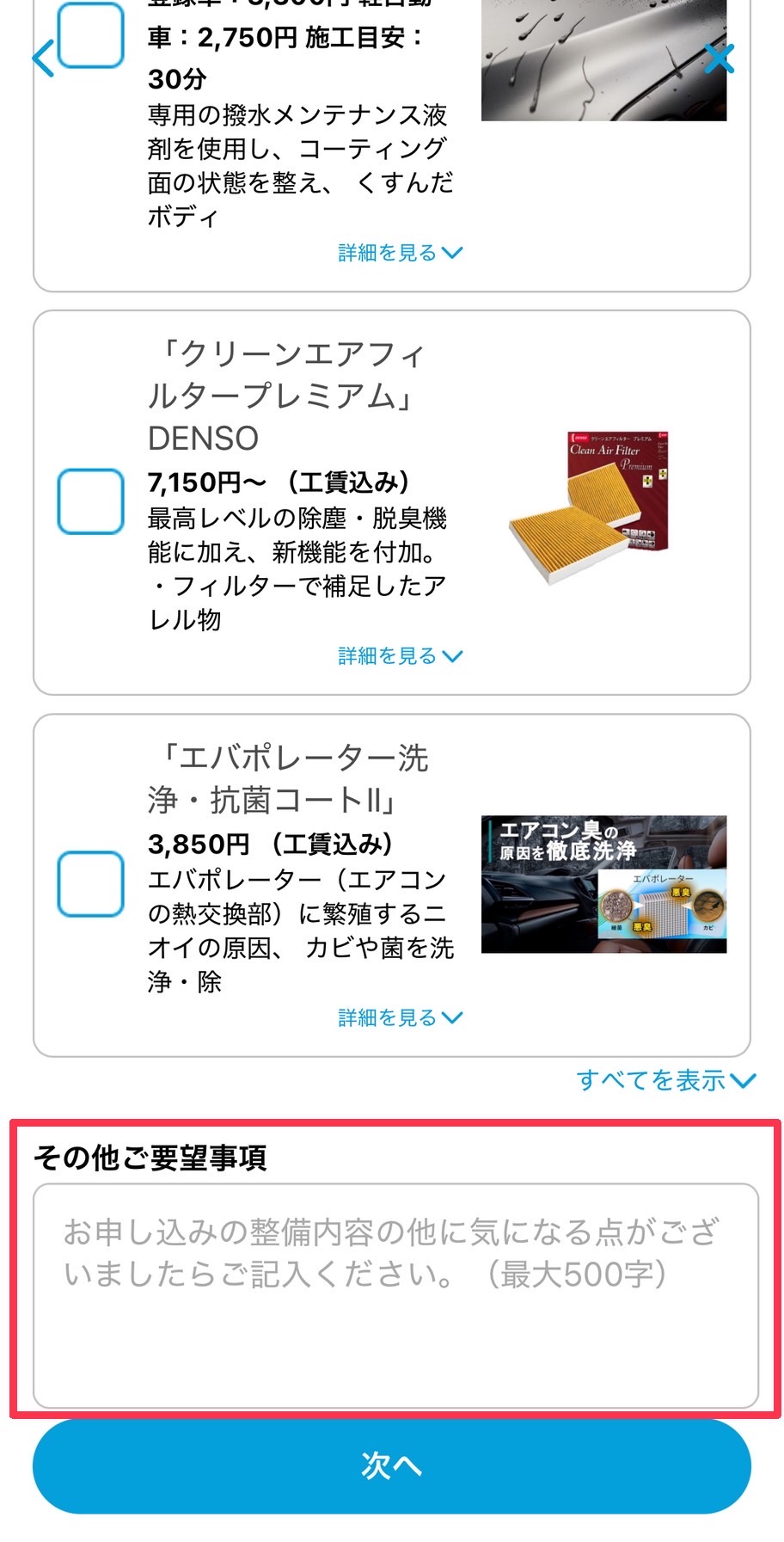 →選択項目以外にも気になる点がある場合や、追加の整備をご希望される場合には“その他ご要望事項”にご入力をお願いいたします。