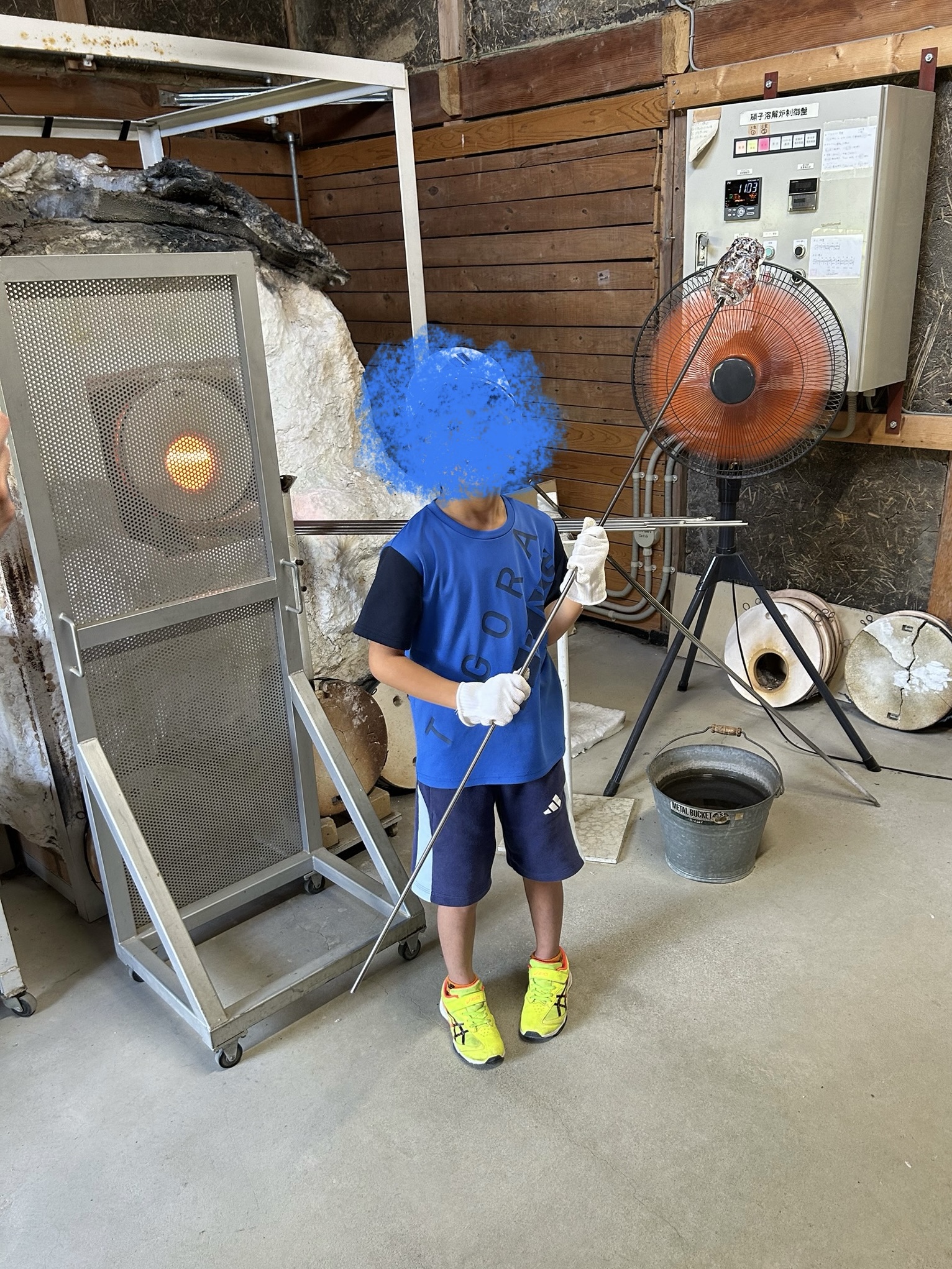 高温のかまどの中に液体状のガラスを付けた金属棒を入れて、かまどの中で回転させながら成形していきます。
