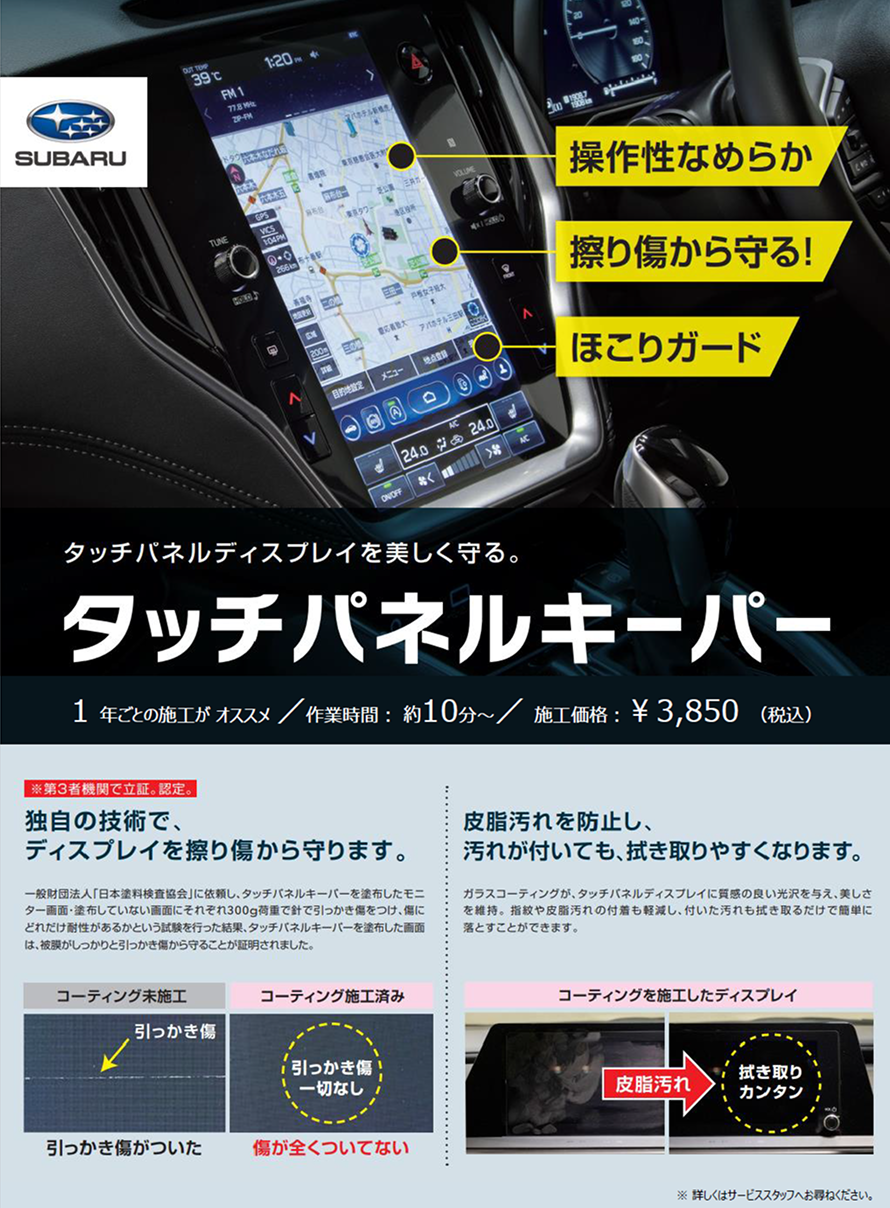 スバル車の11.6インチディスプレイは画面が大きくて見やすいのが特徴ですが、全面タッチパネルのため指紋やほこり等の汚れが目立ってしまいます。