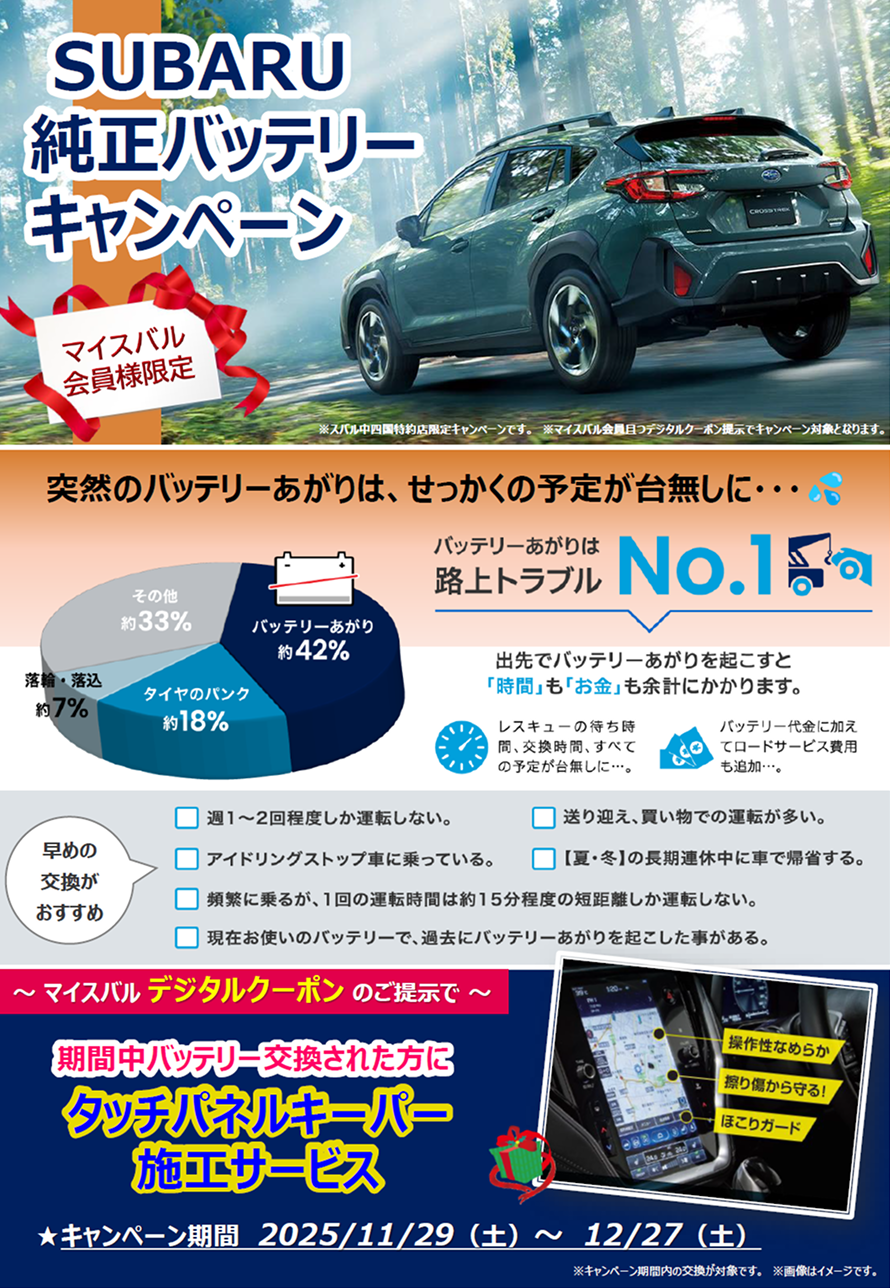 近々バッテリーを交換する予定の方、前回点検時にバッテリーの指摘があり気になっている方、今なら通常3,850円(税込)のタッチパネルキーパーが無料施工ですよ!