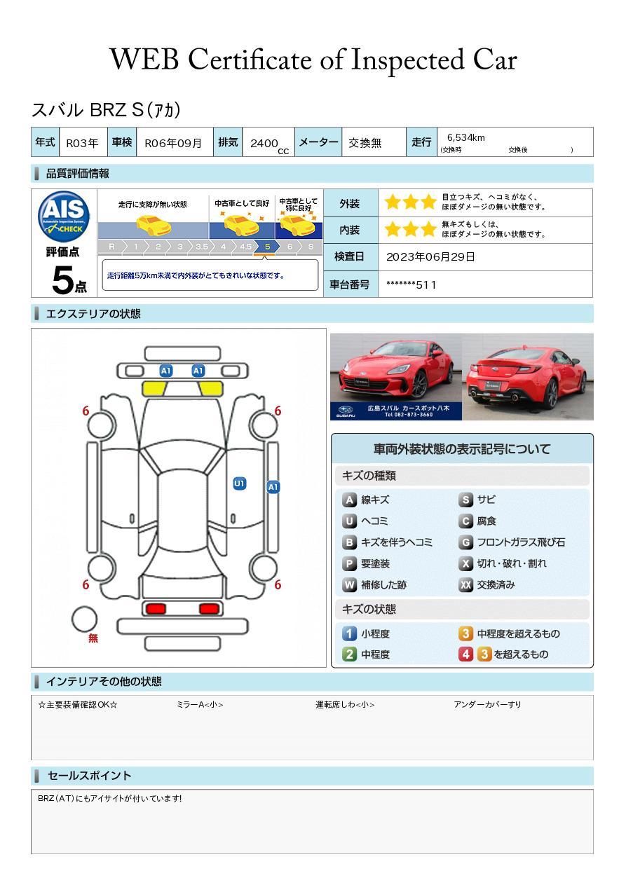 2.4L / 2021年式 / 6,534キロ / RWD / EyeSight搭載車 / 6AT