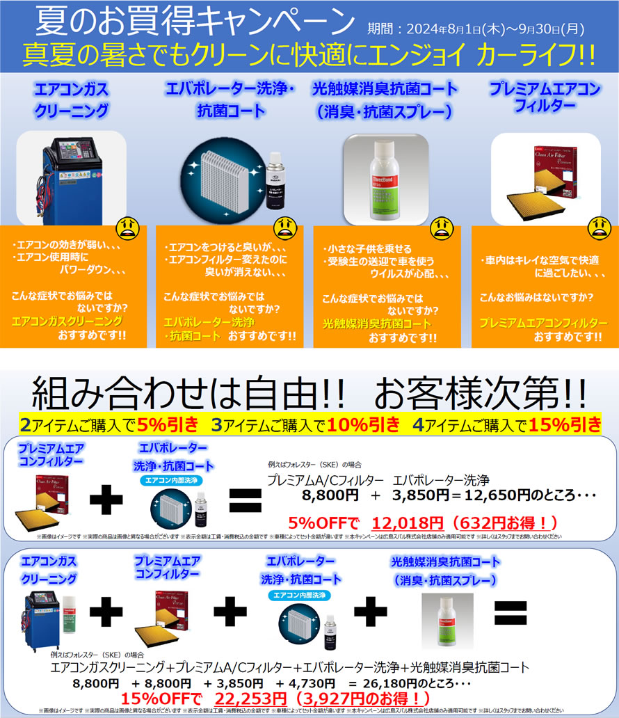 そこで、広島スバルでは9月末まで「夏のお買得キャンペーン」としてカーエアコンのお手入れメニューを特別価格にてご提供中👏✨✨