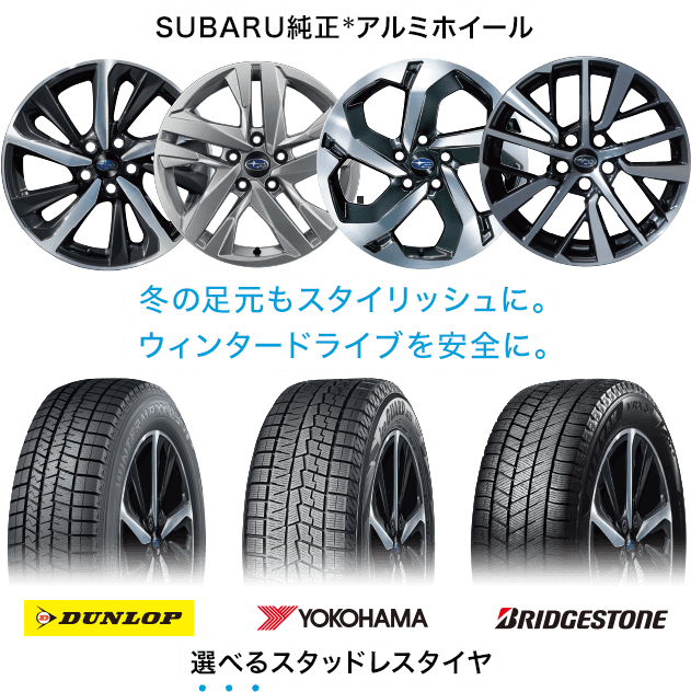 SUBARUの「スタッドレスタイヤセット」は、スタッドレスタイヤ、SUBARU純正アルミホイール又はスバル用品純正アルミホイールとセンターキャップ、エアバルブを組付け、バランス調整した商品です。