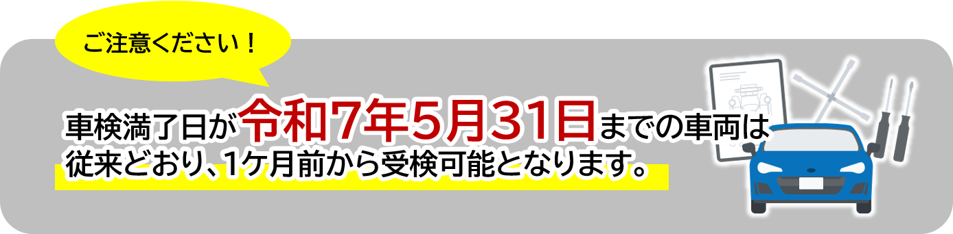 2025年(令和7年)4月1日~5月31日が満了になっている車両は現行制度の1ヵ月前から車検を受けていただきますようにお願いいたします🙇♂️