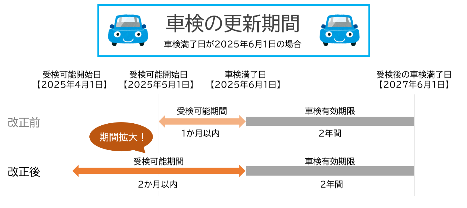 たとえば、2025年(令和7年)6月に車検証の有効期間満了を迎えるおクルマは、2025年(令和7年)4月から受検可能となります![]()