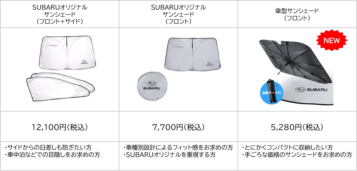 スバルオンラインショップではこの度発売した商品をあわせて3種類のサンシェードをご用意しております。