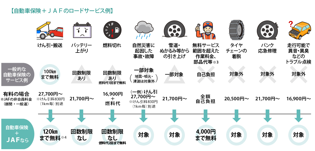 上記すべてにJAFを呼ぶことができ、JAF会員は無料で受けられます!!