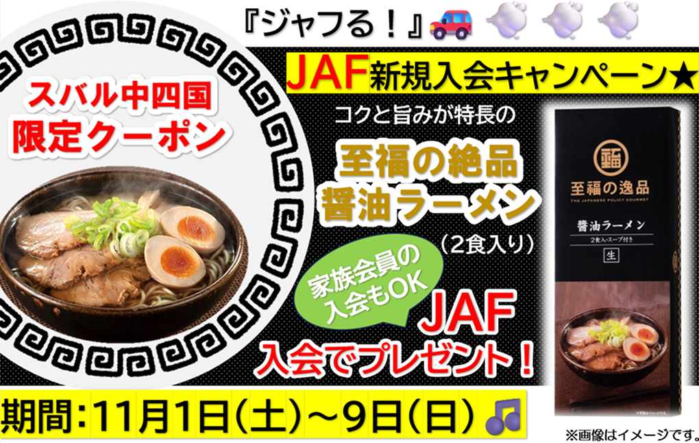 『ジャフる!』ラーメンプレゼントクーポン🍜 有効期間: 2025年11月1日(土)~9日(日) 備考 : ※スバル中四国株式会社限定のキャンペーンです。賞品が無くなり次第終了となります。 このクーポンは現在ご利用いただけません。