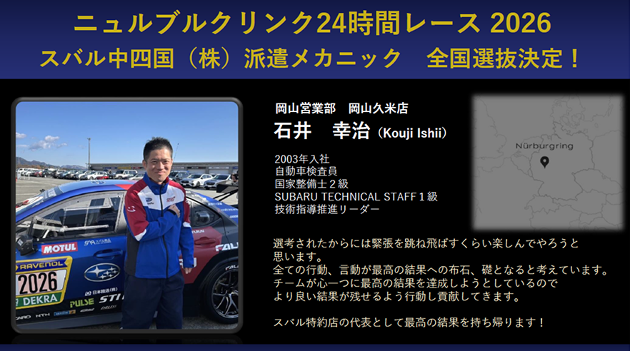 ちなみに、2026年ニュルブルクリンク24 時間耐久レースでは、我らがスバル中四国(株) 岡山エリアのメカニックが参戦いたします🎉