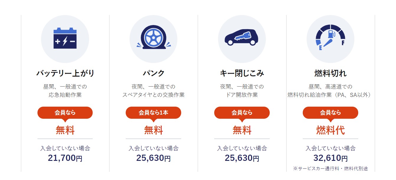 また、JAF会員のお客様は以下のサービス等を無料で受けることが可能です。