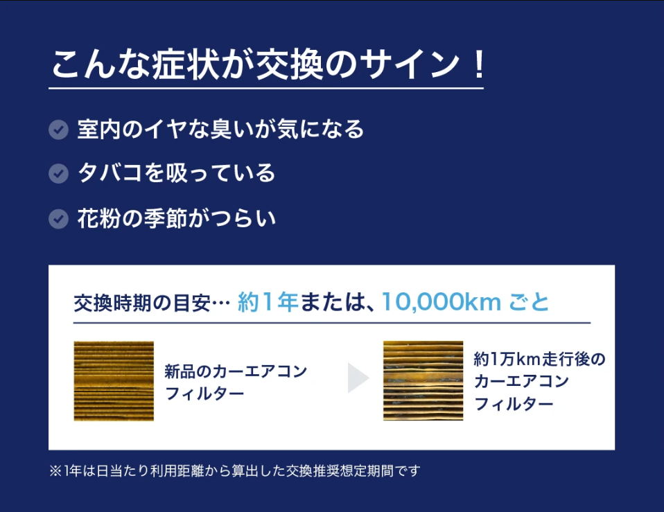 「最近、車内のニオイが気になる」「エアコンの風が弱くなった気がする」という場合も、交換のサインです。