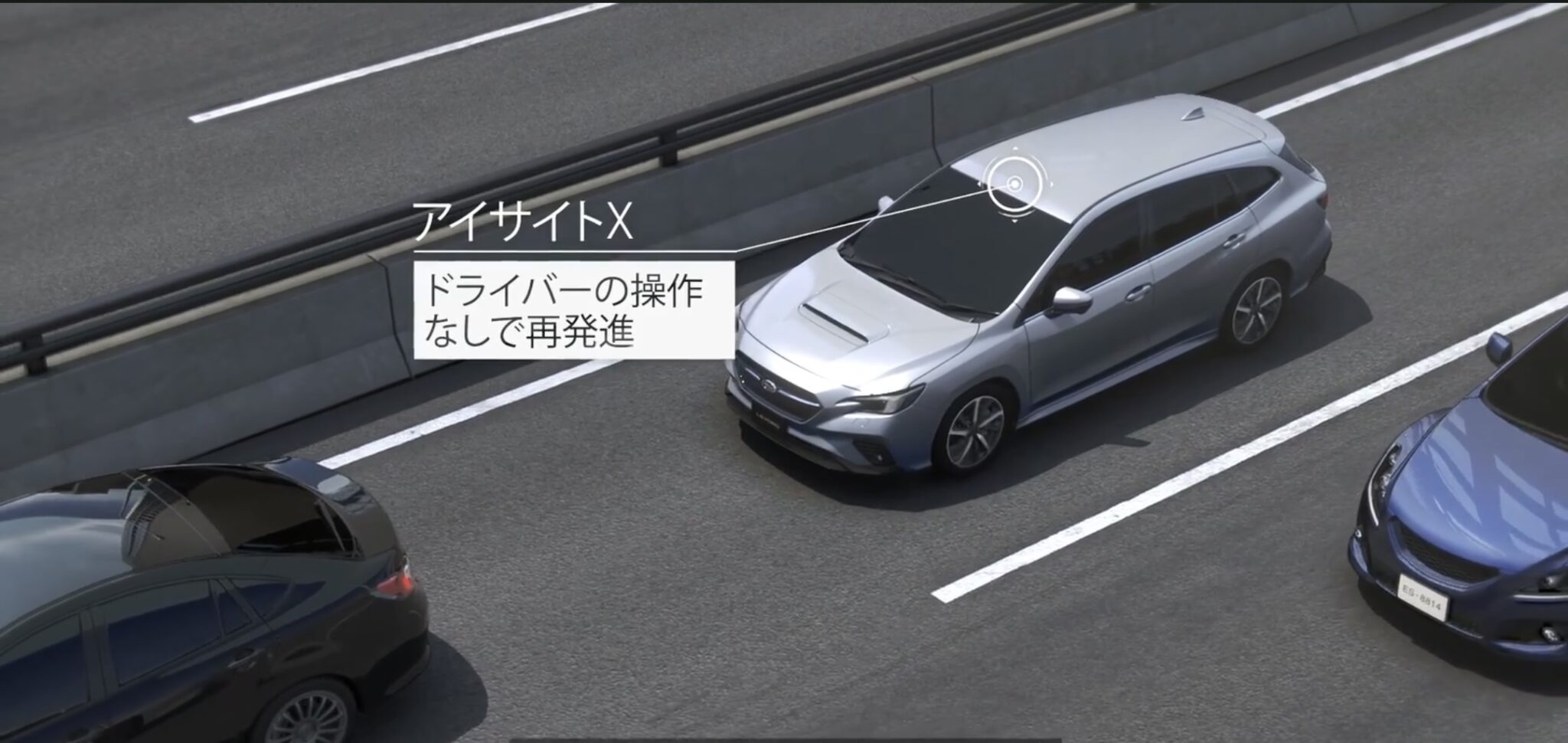 高速道路や自動車専用道路を走行時、先行車に続いて自車が停車してから約10分以内であれば、運転者の操作なしで先行車に追従して再発進します