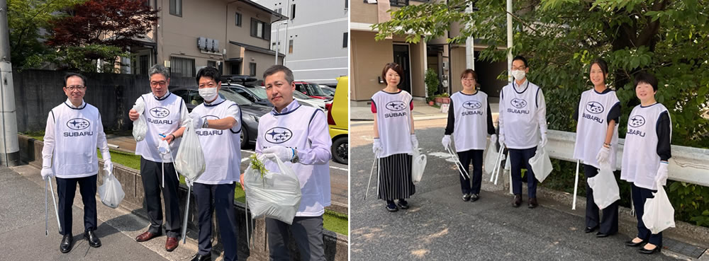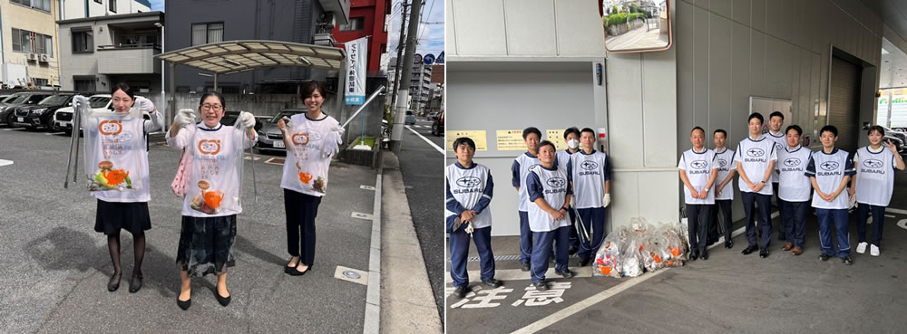 中四国スバルグループ全体取組みとして、3ヶ月に1度、店舗周辺の地域清掃を実施しております。 朝の掃除の時間を周辺清掃に切替えて各店舗ごとに実施しています。この日も40数名の本社スタッフで20分ほどの清掃を行いました。 前回の実施より、缶やペットボトルが多く回収できました。清掃活動はお揃いのビブスを着用して行いますので、一体感が高まります。また道行く地域の方からの激励や感謝のお声がけがモチベーションにもなります。 私たちは、SUBARUのクルマだけではない活動や魅力をより多くの方に知っていただきたいと思っています。地道な活動ですがこれからも永く続けてまいります。
