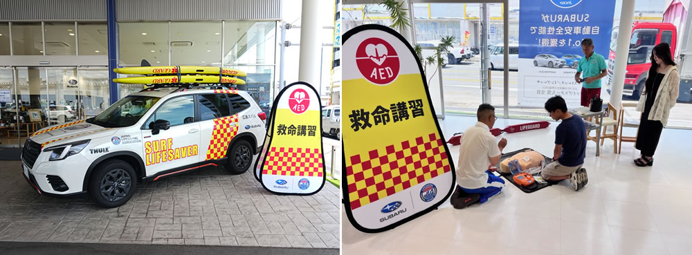 スバル中四国(株)では、「一つのいのちプロジェクト」の活動としてライフセーバーカーの提供をはじめ、中四国エリアのライフセーバーをサポートしております。今回は、「いのちを守る」ために活動されるライフセーバーについて知っていただきたいとの思いで、8月2日~10日の期間中、スバル中四国の7つの店舗でライフセービングサポーター講習会(BLS講習・一次救命処置)を開催いたしました。 普段なかなか接することが無い現役ライフセーバーの皆さんから救命時の基本となる「胸骨圧迫」と「AEDの使用法」についてレクチャーを受けました。当日の様子をご紹介いたします。