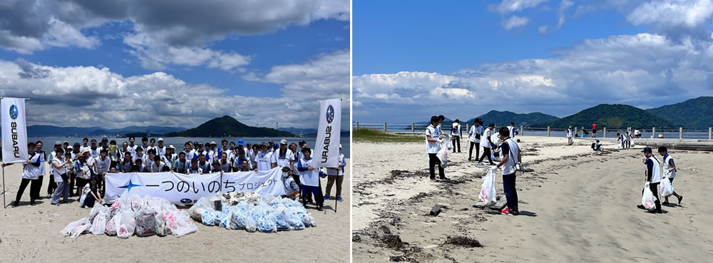 我々の活動エリアは多くを海に面しています。だからこそ海の豊かさ、自然の豊かさを守りたい。 そんな思いで広島スバルで初めての海岸清掃活動を実施しました。場所は、広島市内から一番近い海水浴場として人気の「ベイサイドビーチ坂」。 74名の参加者は思い思いにゴミ拾いを実施しました。「カキ養殖」用のプラスチック管と、発泡スチロール片が多く回収できました。打ち上げられた海藻の中に混じって、プラスチックトレーなどの生活ゴミもありました。 初夏の海辺は暑かったですが気持ちのいい汗をかいて笑顔のイベントとなりました。 広島スバルは今後も清掃活動を通して、未来に豊かな自然を残すと共に地域の皆様に愛される企業を目指します。