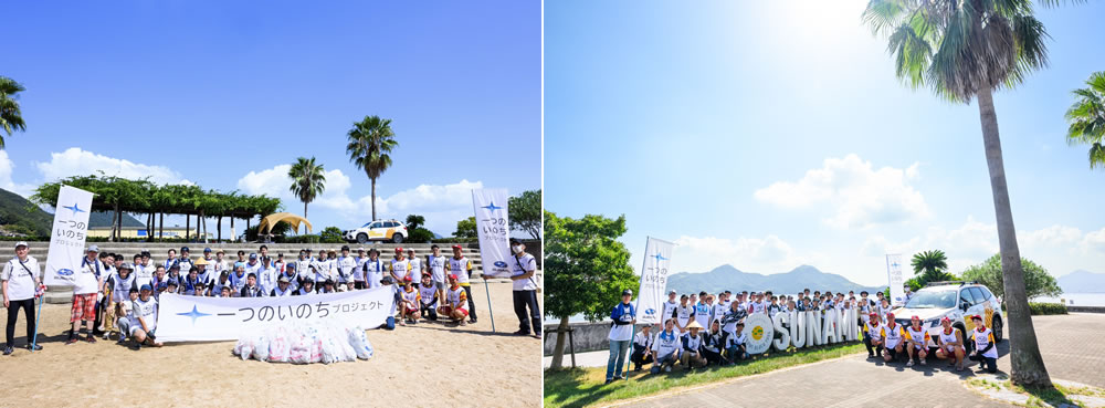 広島スバルでは、6月に続き2度目となるビーチクリーンを、三原市すなみ海浜公園にて実施しました。今回は、「一つのいのちプロジェクト」に一緒に取組む広島県ライフセービング協会のライフセーバーさんと、会社の取引先さまにもご参加いただき、総勢55名で活動しました。もともとキレイに整備されたビーチでしたので砂浜に大きなゴミはありませんでしたが、公園一帯、駐車場まで範囲を広げてゴミを回収しました。当日は9月中旬とはいえ、真夏の様な暑さでしたが、参加者は、波の音を聞きながら思い思いにゴミ拾いをしました。清掃活動で、可燃ごみ、不燃ごみそれぞれ52袋、合計104袋のゴミが集まりました。海洋ゴミの多くが陸地から流入する生活ゴミ(プラスチック等)と言われています。広島スバルでは今後も身近なゴミ問題に向き合い、清掃活動を通して、社員の環境意識向上と「自然のいのち」の保全に取組みます。