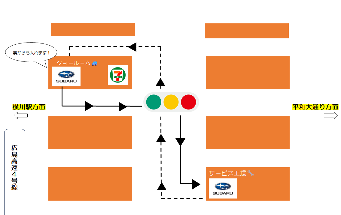 中広店は、ショールームとサービス工場が少し離れた場所にございます。